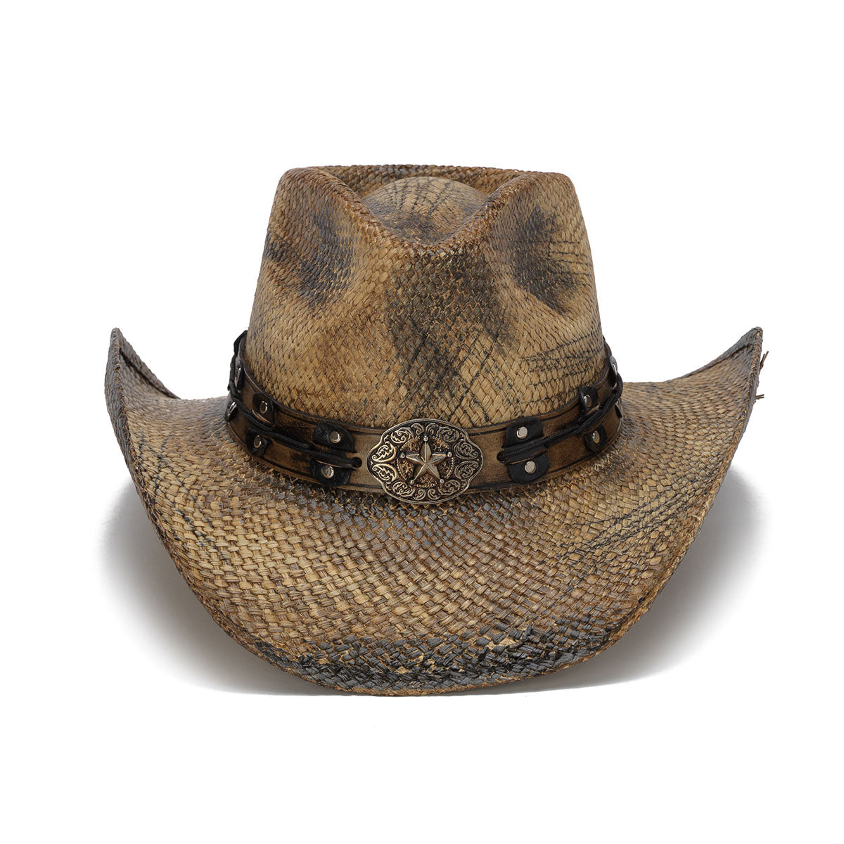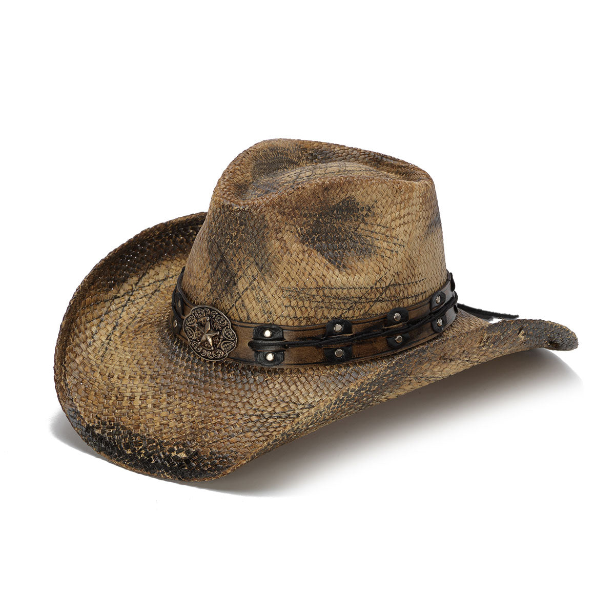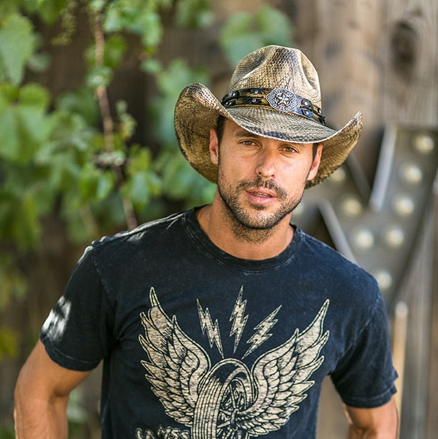The ANACONDA hat is crafted from 100% genuine Panama straw for an authentic look and feel. Featuring a star buckle and genuine leather band with round studs, it adds a touch of stylish detail to any wardrobe. The 3.75 inch brim completes this classic look from the Stampede Collection.
