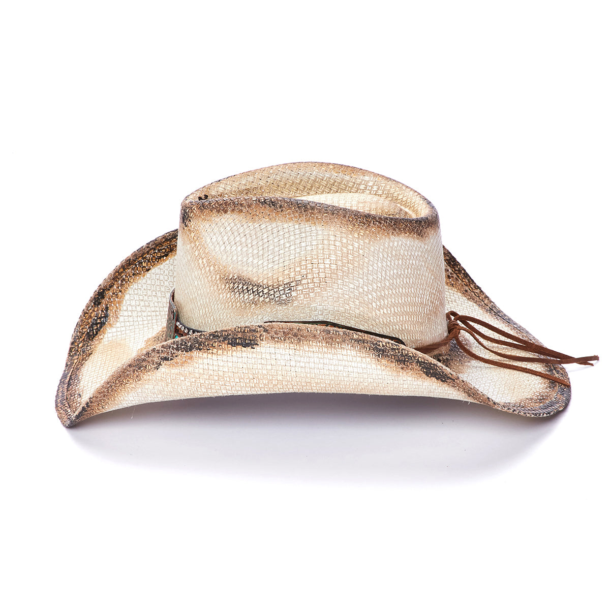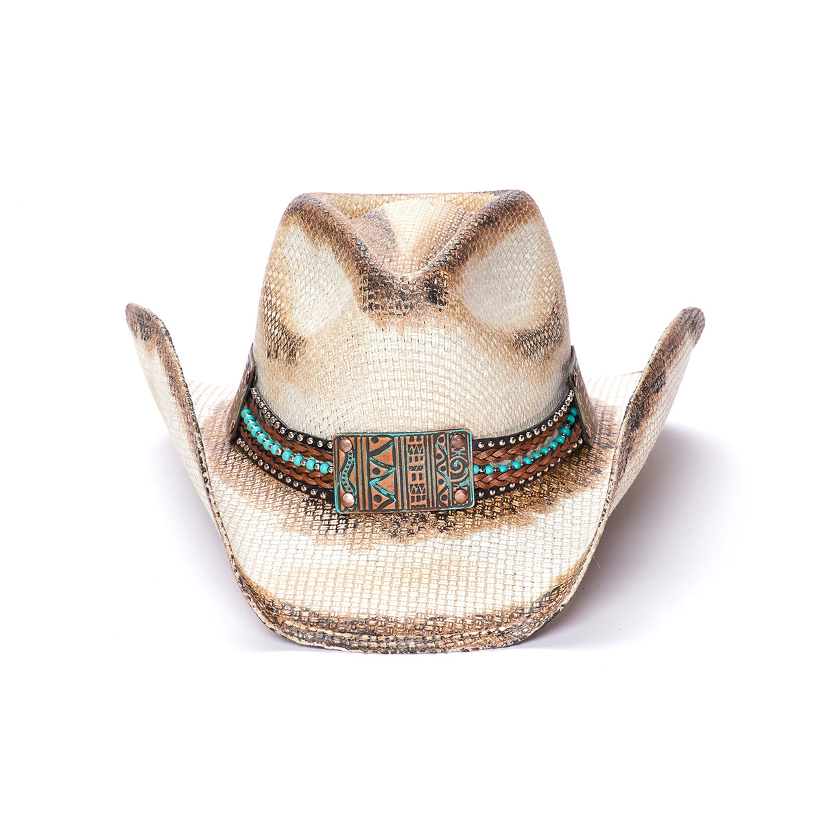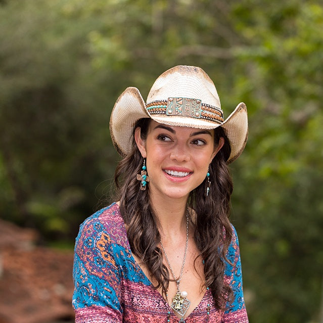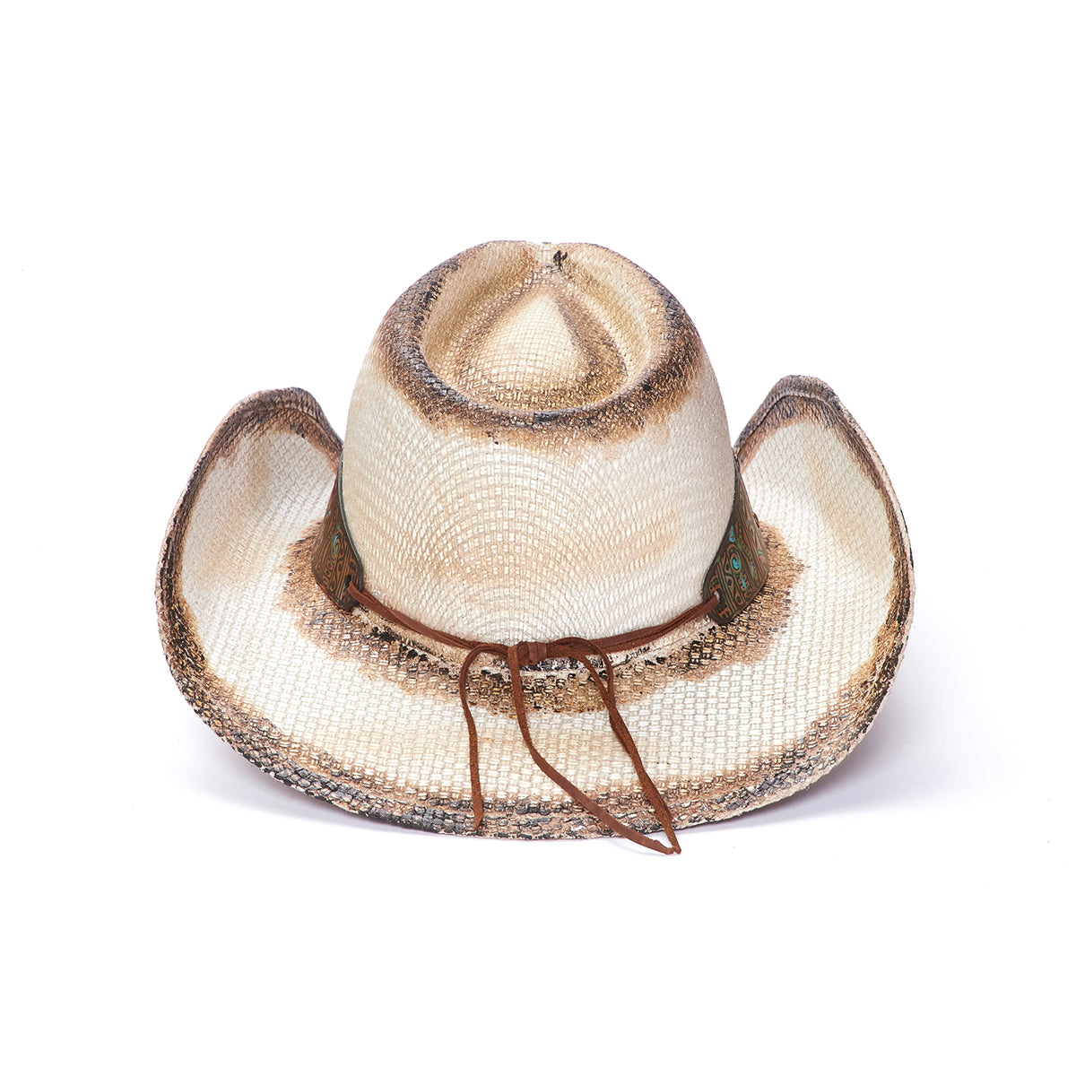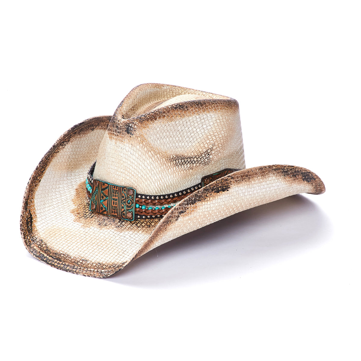 The BLAZE Canvas Hat offers an eye-catching style of its own. Crafted from authentic leather and designed with turquoise and copper accents, this hat from the Stampede Collection features a 3.75 inch rolled brim and mini studs. An intricate buckle adds the perfect finishing touch.