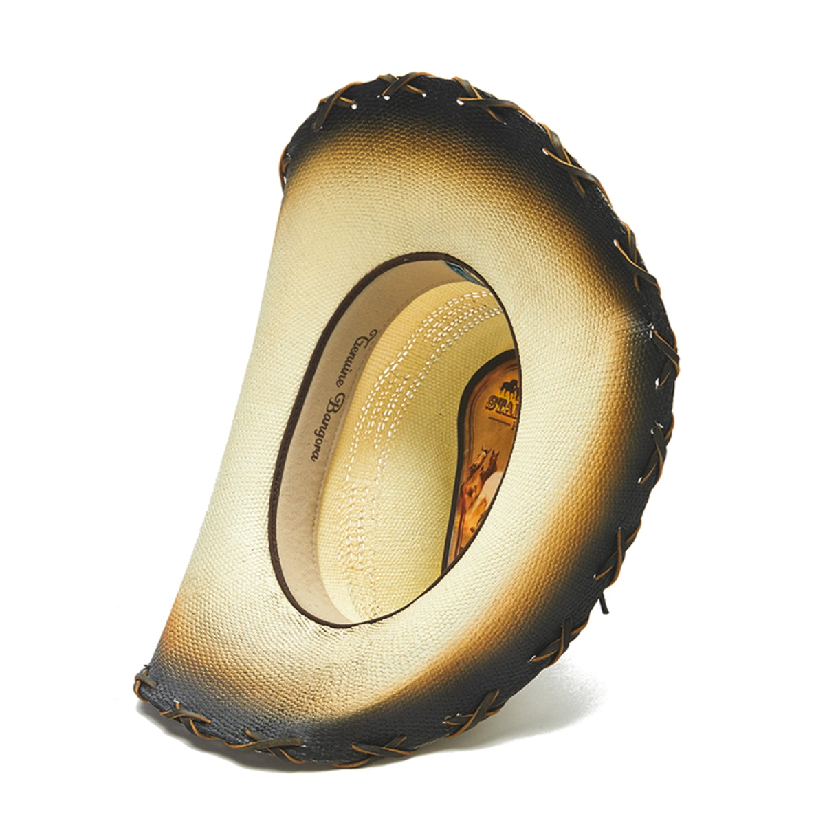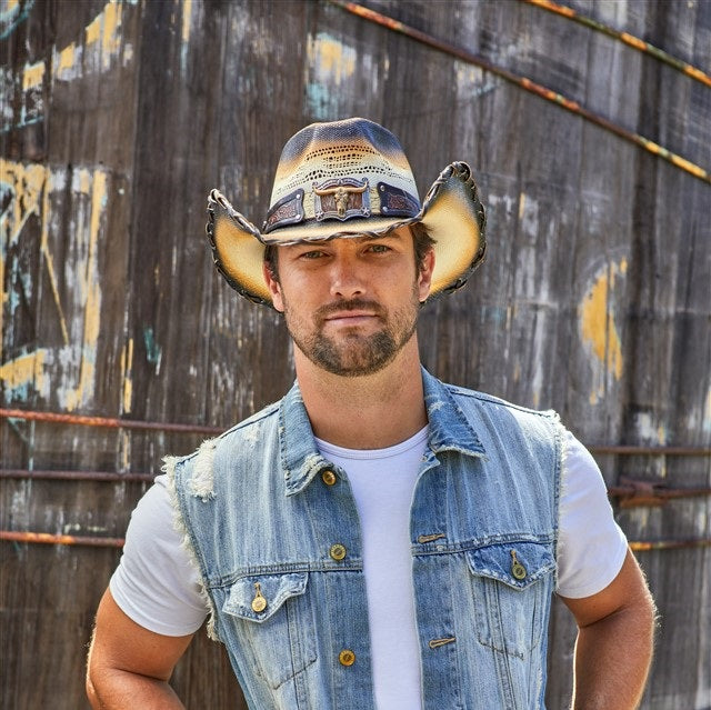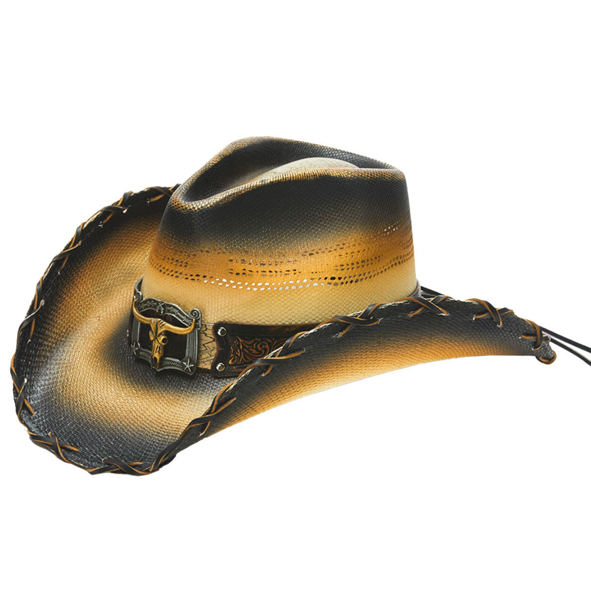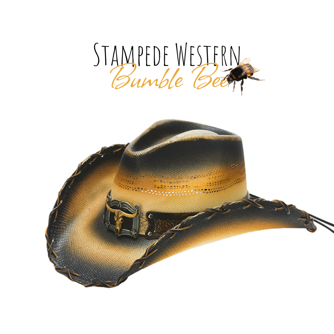 The BUMBLE BEE hat is made from genuine Bangora straw and genuine leather, boasting an intricate design and studs. It features a 4 inch brim with vented crown and a longhorn buckle. The brim is also cross-stitched for extra durability. Part of the Stampede collection, this hat is sure to make a statement.