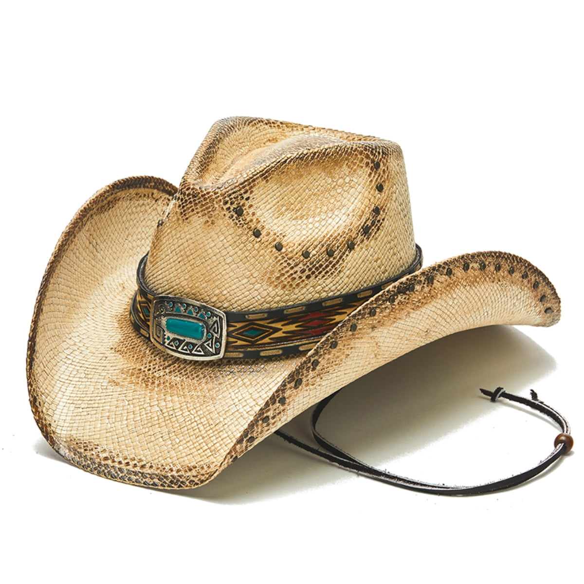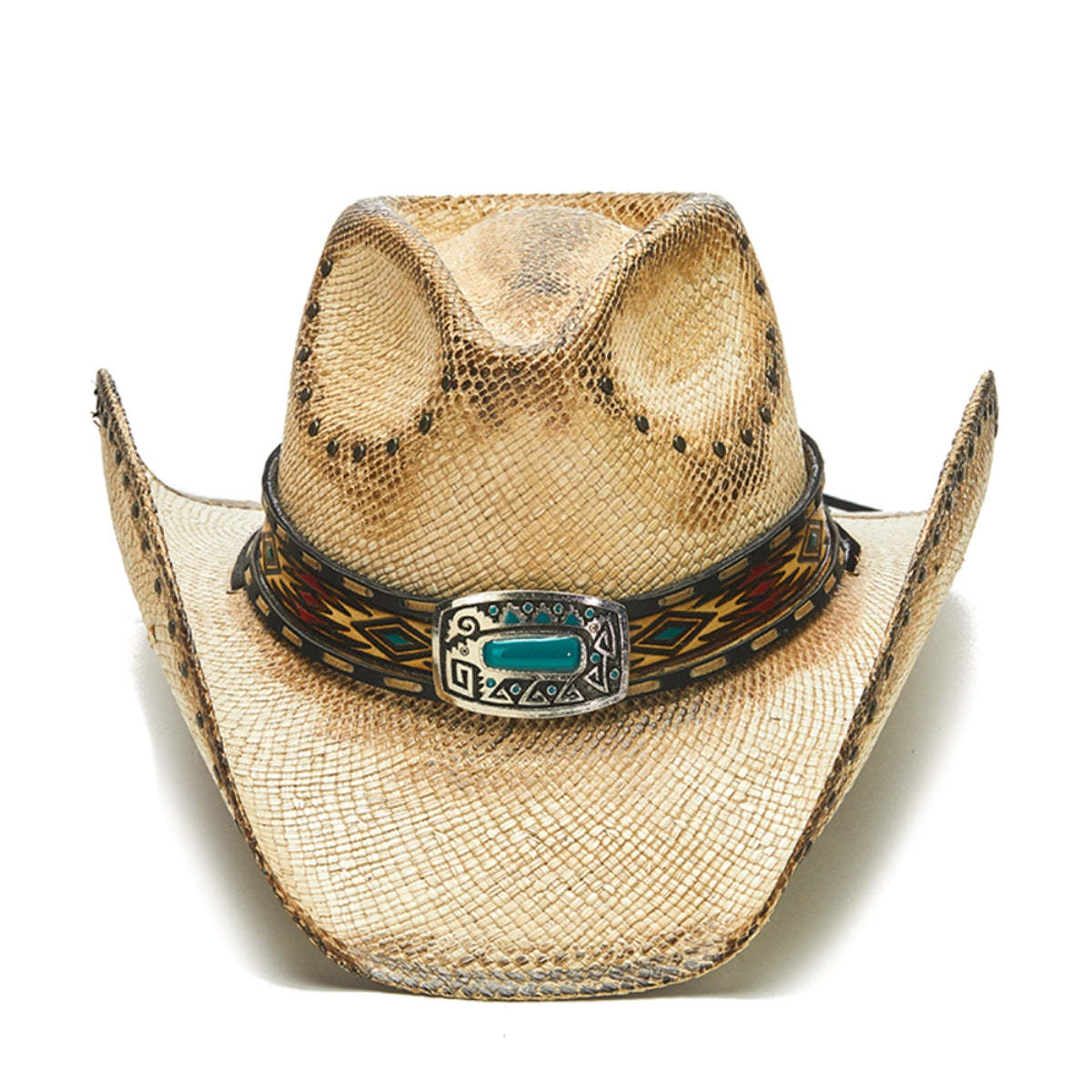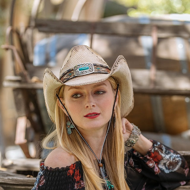 HERDER is a truly unique hat, crafted with genuine Panama straw and genuine leather for a combination of durability and style. Its adjustable chin cord ensures the perfect fit, while the stampede collection makes sure you stand out with intricate design, studs on the crown and under the brim, and a large turquoise jewel buckle. Whether you're looking for a fashion statement, or outdoor protection, HERDER is the perfect choice.