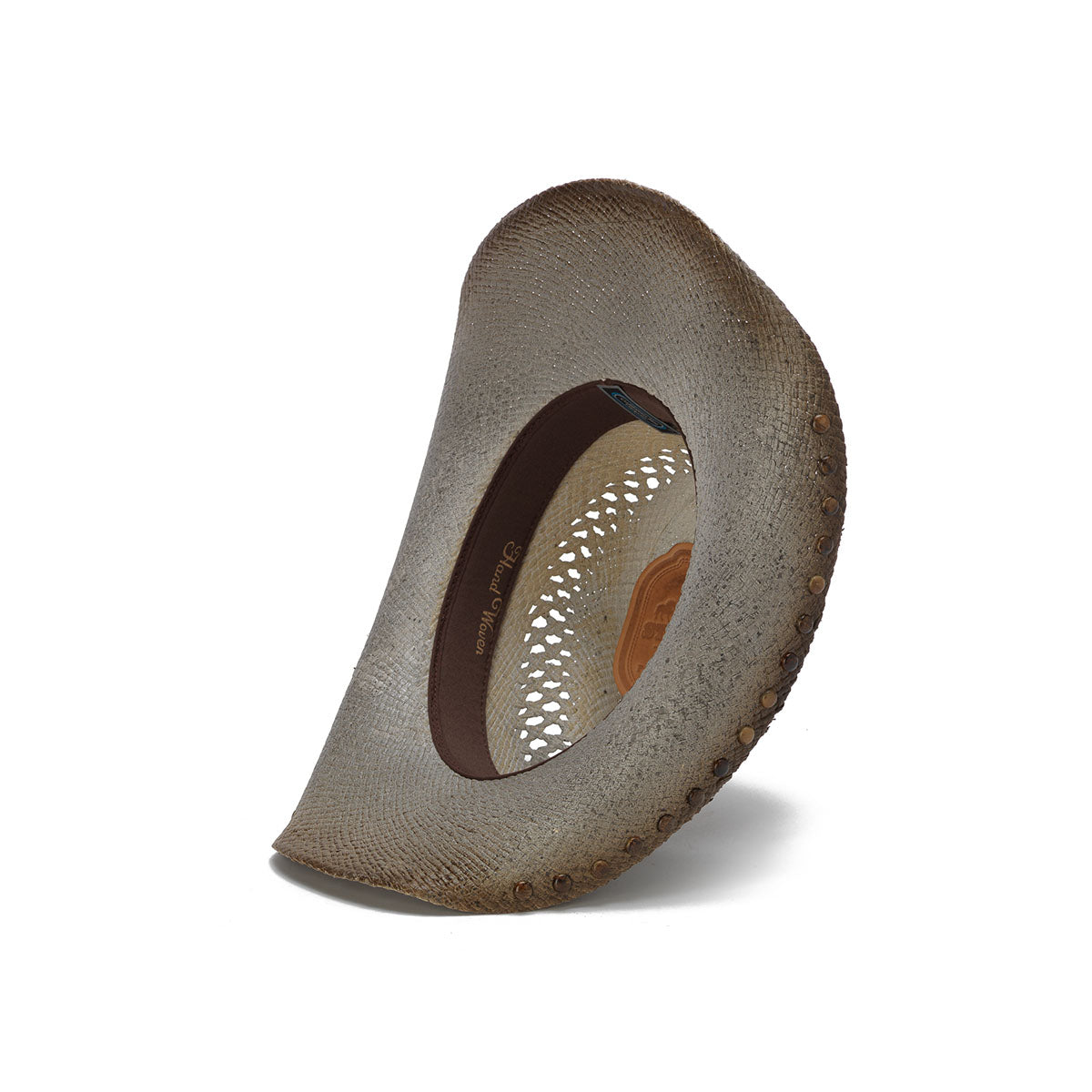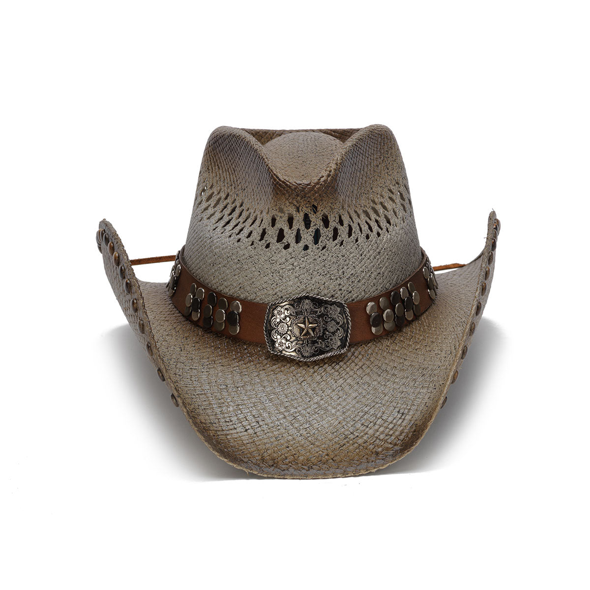 LONESTAR is a stylish cowboy hat from the Stampede Collection. Crafted with a genuine Panama straw, it features a striking star floral concho with brown studs and a genuine leather band with flat studs. The hat has a 3.75 inch brim with a vented crown, ensuring comfort and style. Perfect for a day on the ranch or a night on the town.