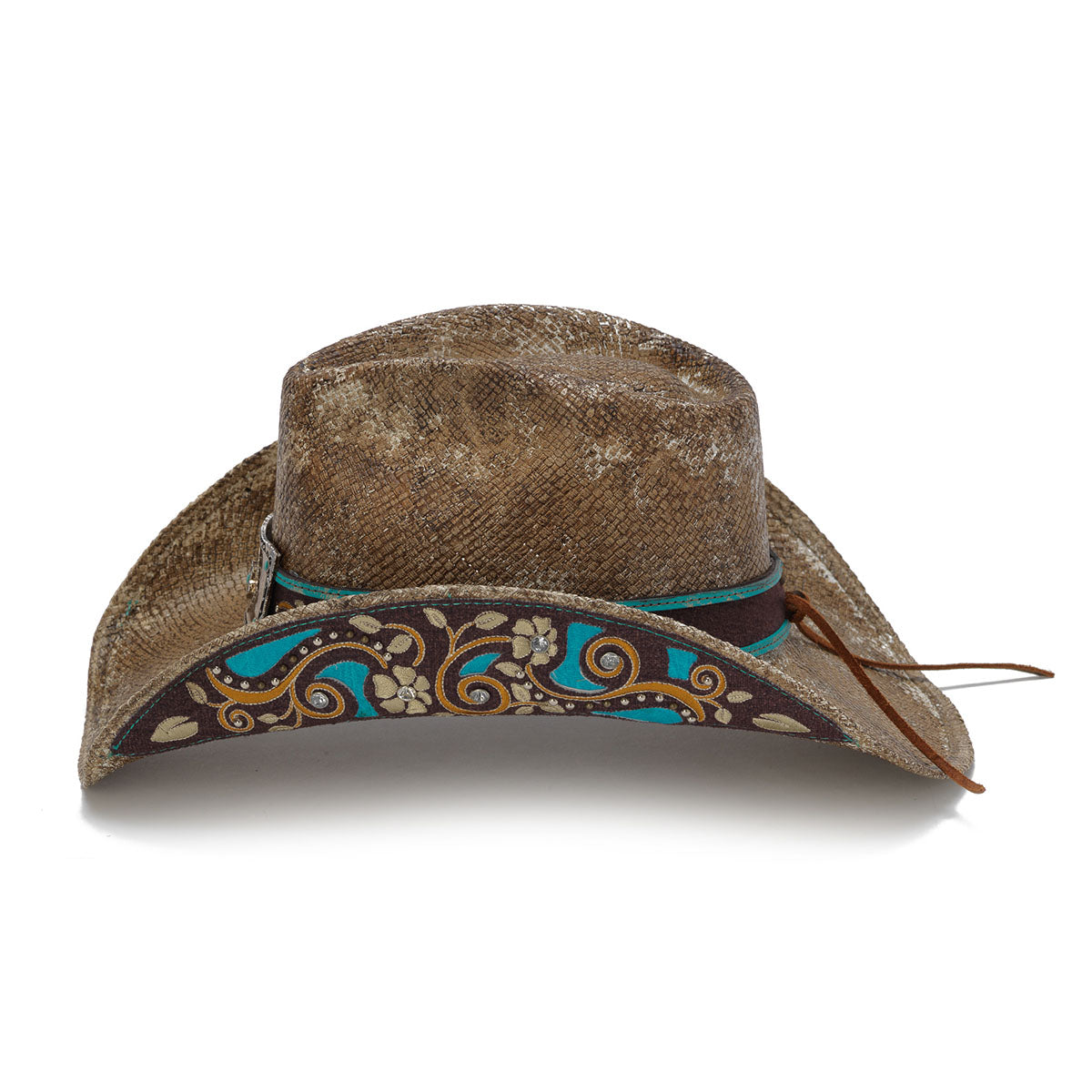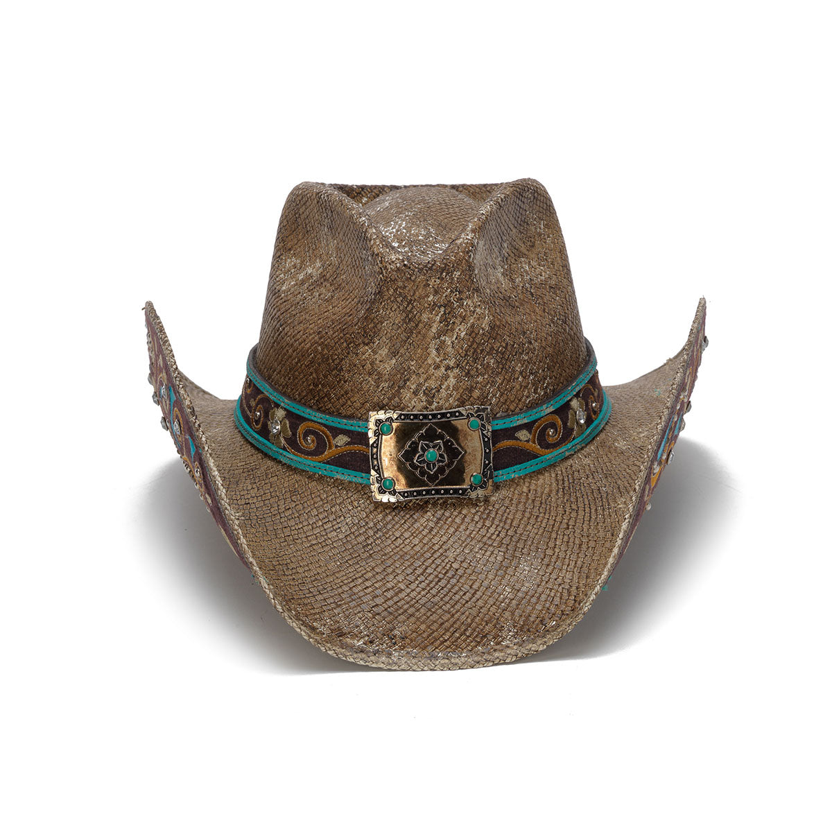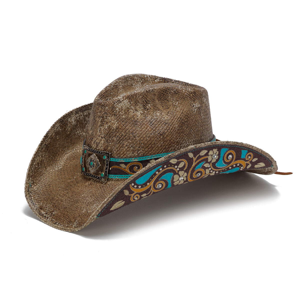 The MORGAN is part of the Stampede Collection, featuring a genuine Panama Straw construction with a floral brown leather band. The brim features a floral embroidered design, completed with a square buckle and turquoise studs. Its 4" brim provides all-day protection from the elements.