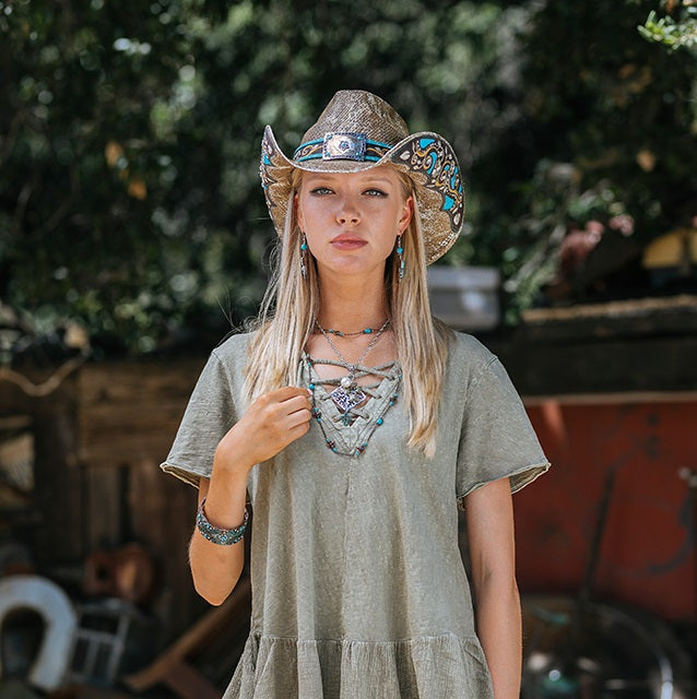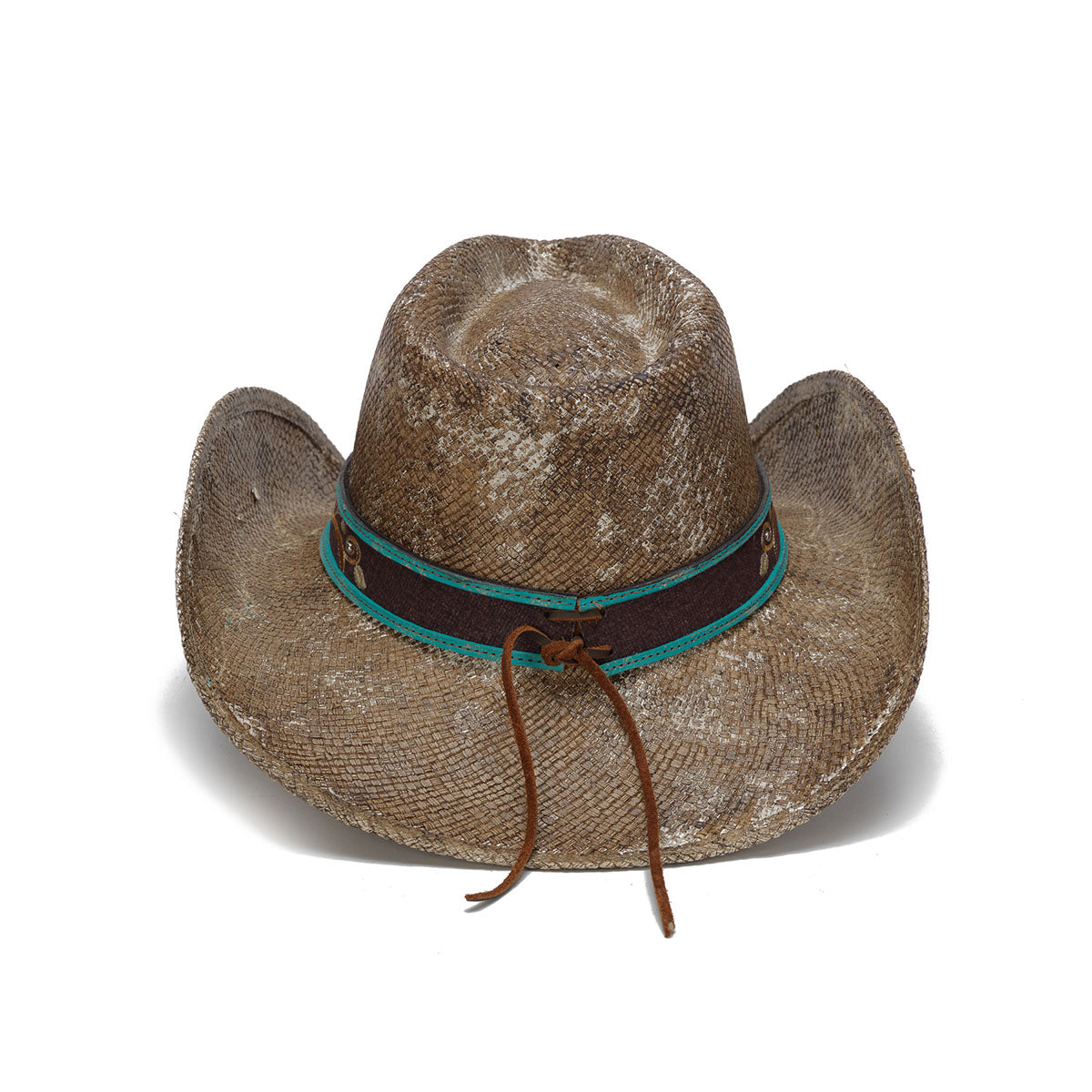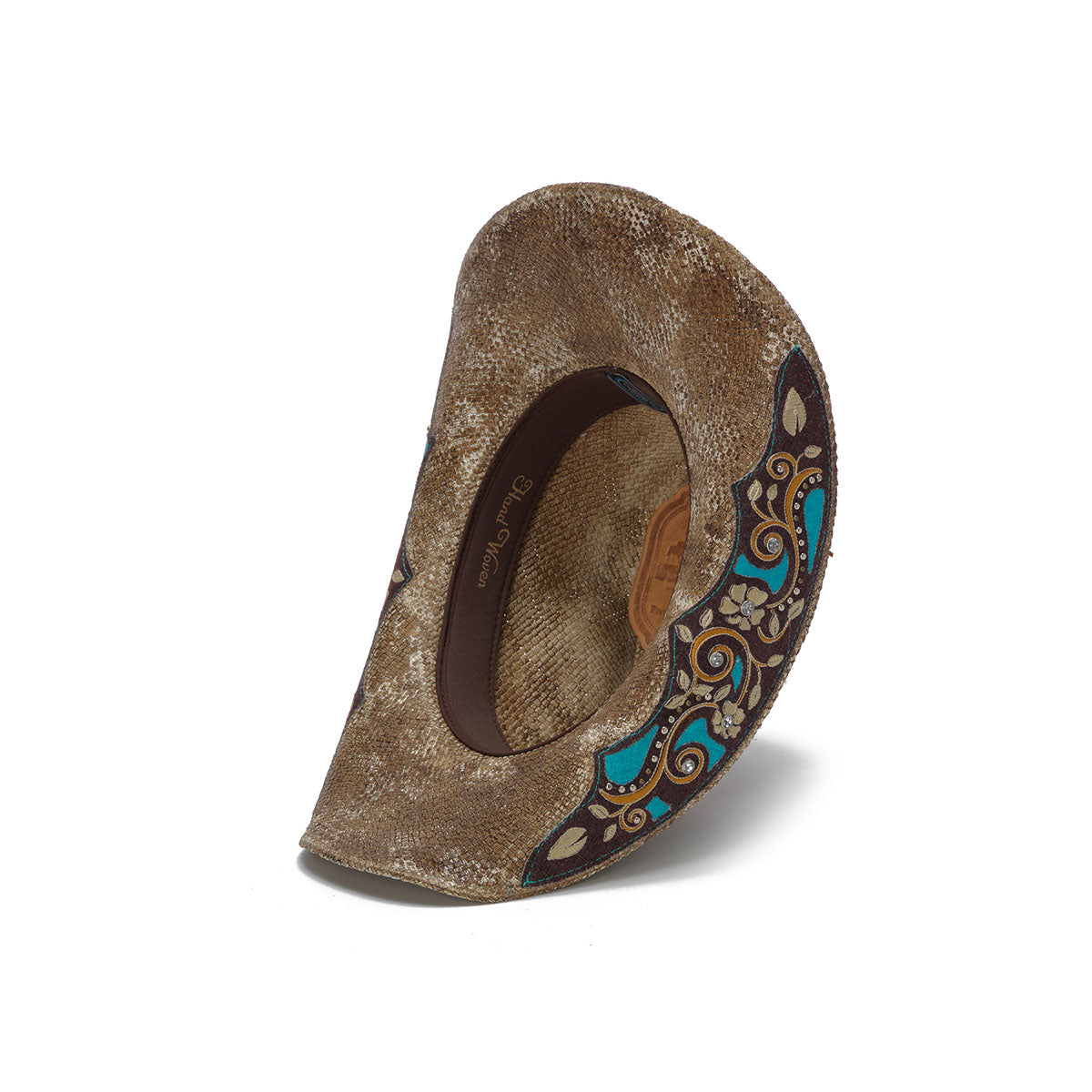 The MORGAN is part of the Stampede Collection, featuring a genuine Panama Straw construction with a floral brown leather band. The brim features a floral embroidered design, completed with a square buckle and turquoise studs. Its 4" brim provides all-day protection from the elements.