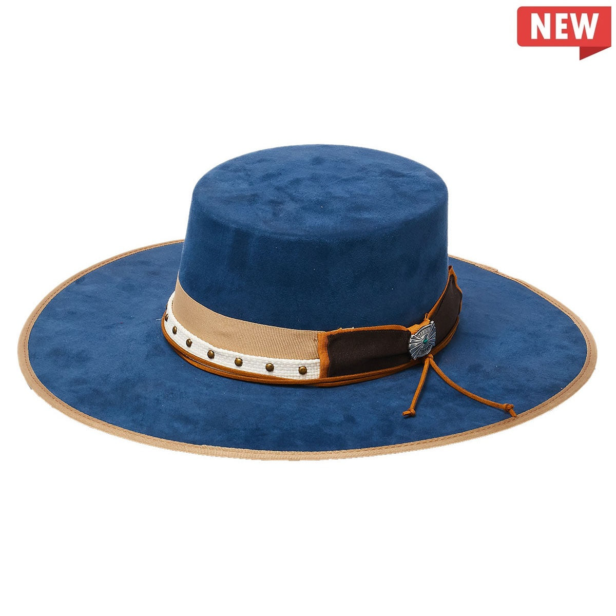 The MYSTIQUE hat is from the Stampede Collection, featuring a polyester suede base, genuine leather band with mini round studs, leather chord, and polyester ribbon with mini turquoise jewel pin. It has a classic 4 inch flat brim and beige trimming for an elegant and sophisticated look.