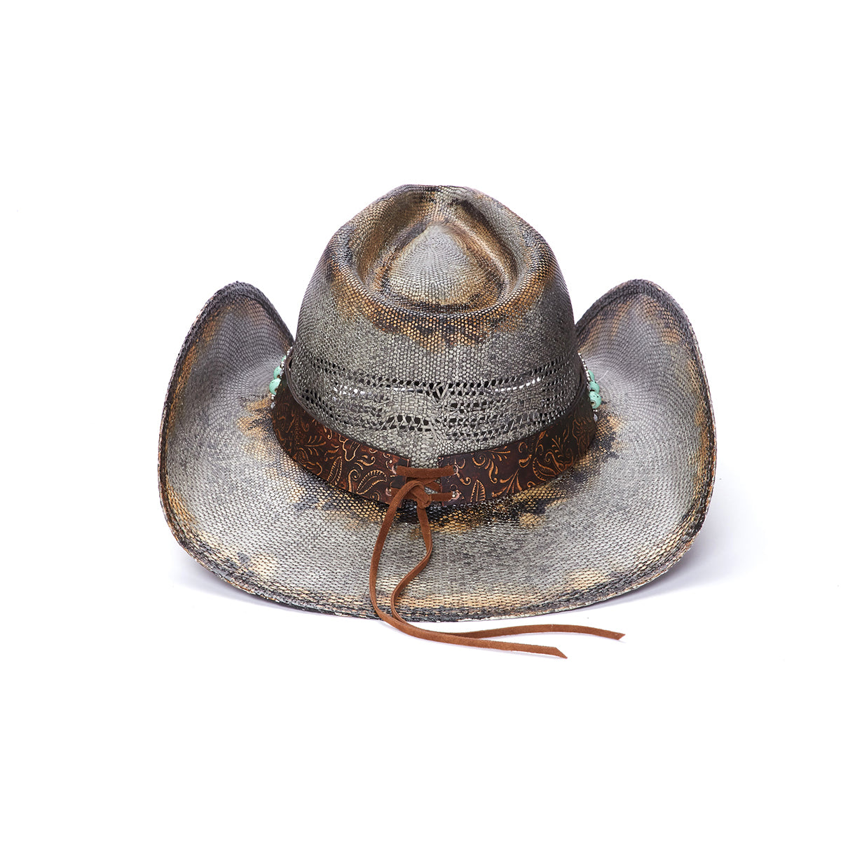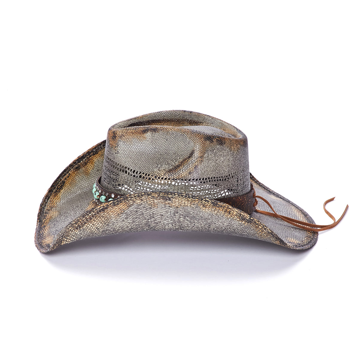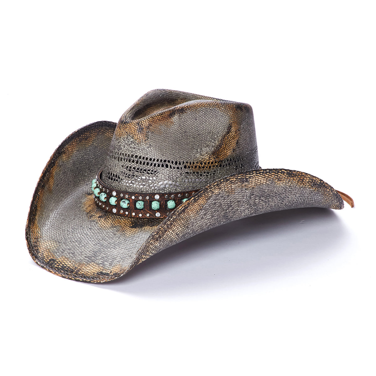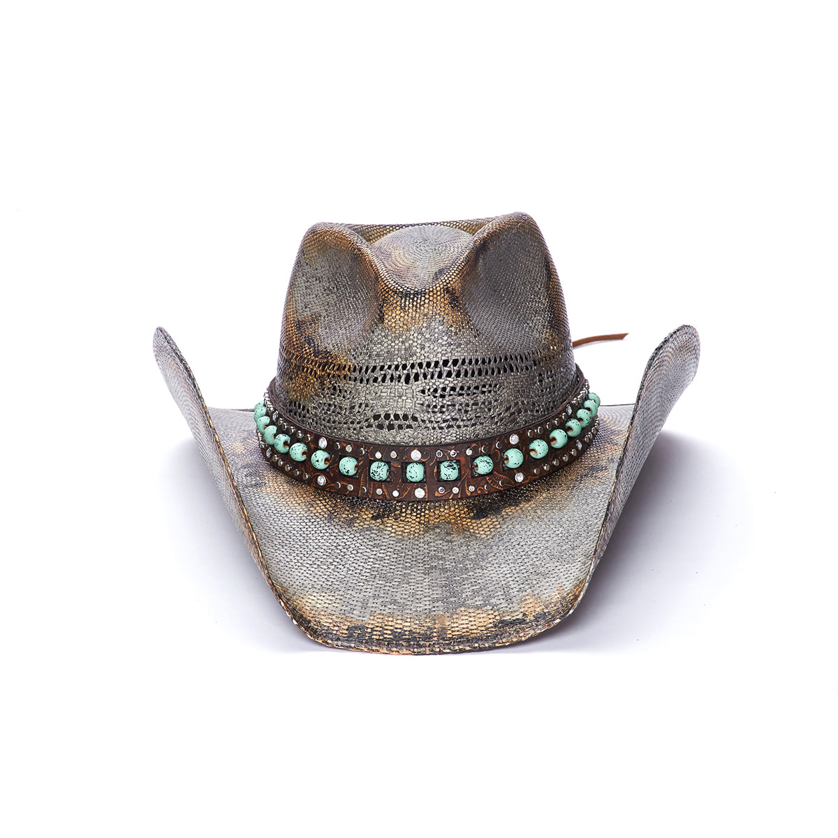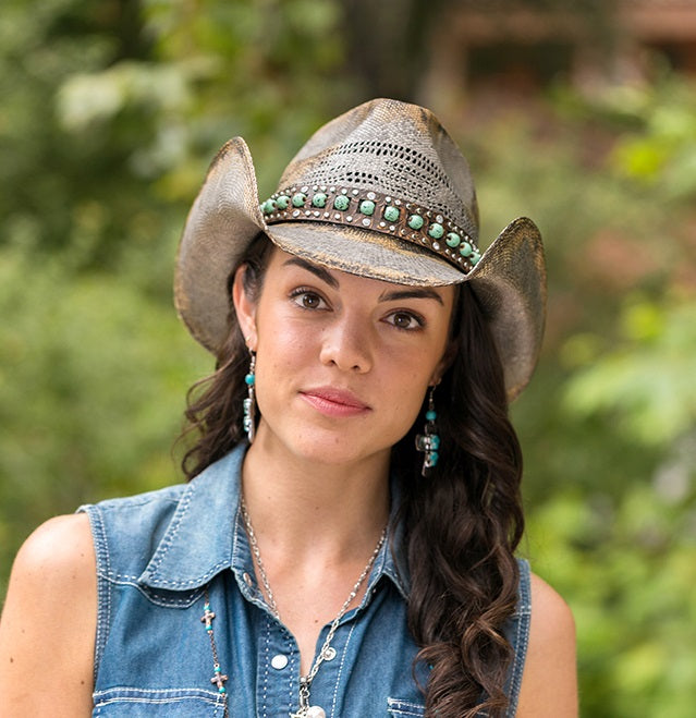 The NIGHT HAWK is an ideal choice for outdoor activities. Constructed from durable and lightweight Bangora Straw, it features a genuine leather band with turquoise beads and mini studs for a unique look. The 3.75 inch brim is vented for breathability, and it's part of the Stampede Collection, giving you extra assurance of quality.