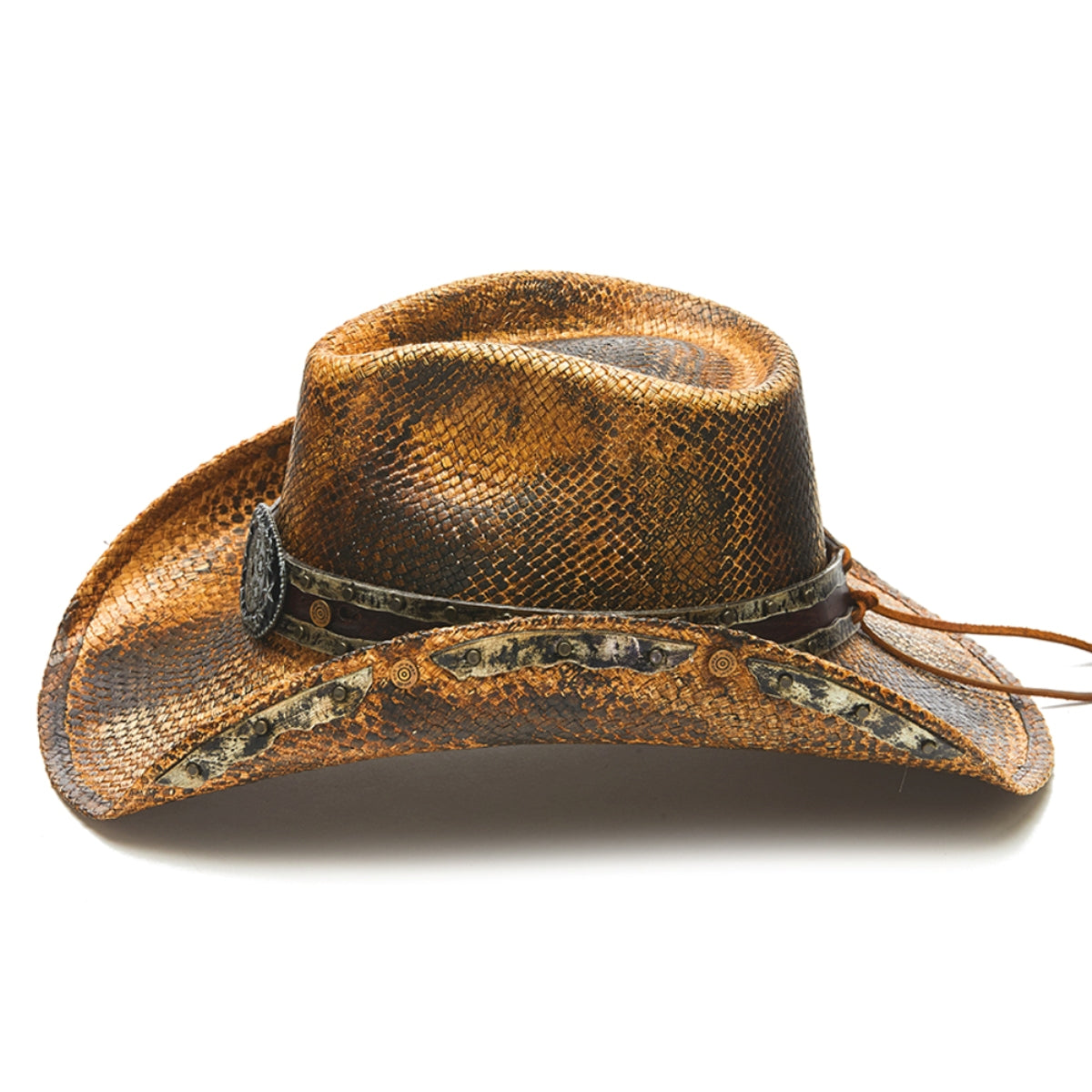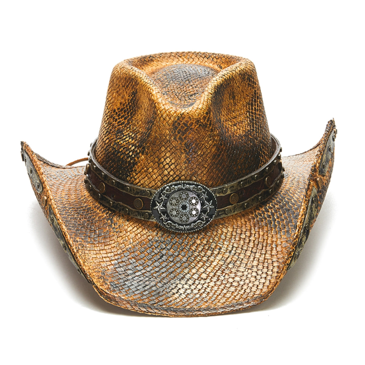 The PYTHON is part of our Stampede Collection. It features a premium Panama straw construction with a genuine leather band and bullet pins underneath the brim. The stylishly eye-catching six shooter buckle completes the look. The 4 inch brim offers sun protection while keeping you looking sharp.