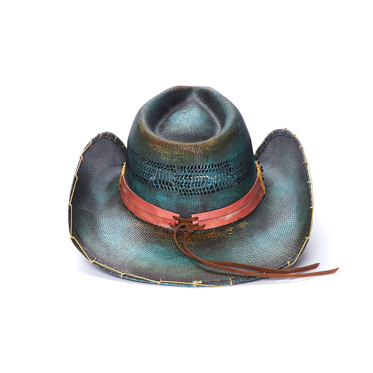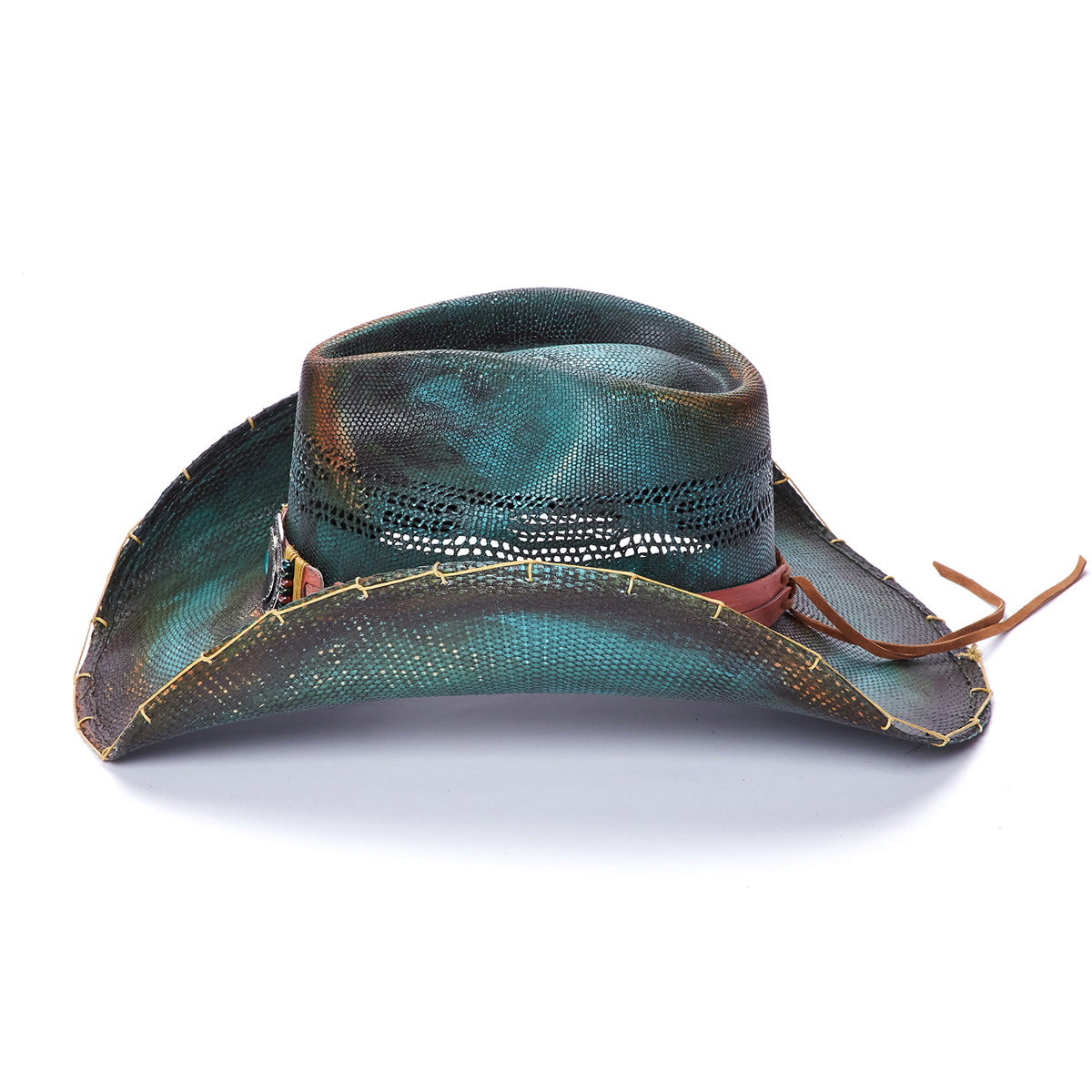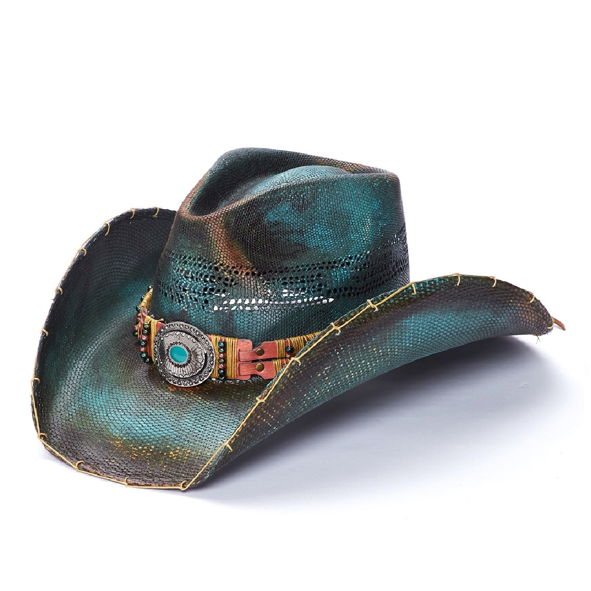 The ROAD RUNNER hat, from Stampede Collection, is the perfect blend of style and function. Crafted with a genuine Bangora straw, genuine leather band with colored beads, a vented crown, and a stitched and bordered rim, it's sure to keep you cool and comfortable. The turquoise centered buckle provides the perfect accent.
