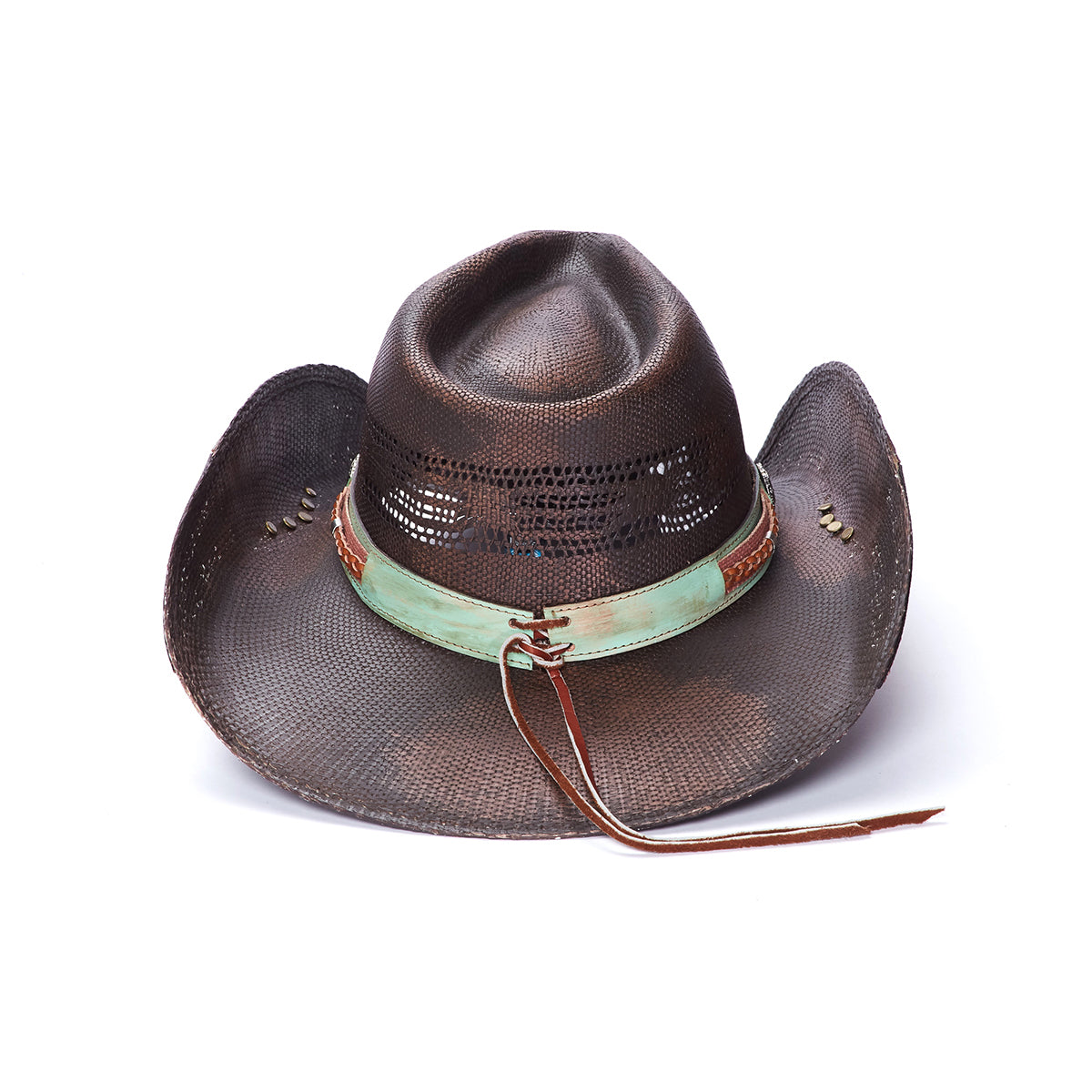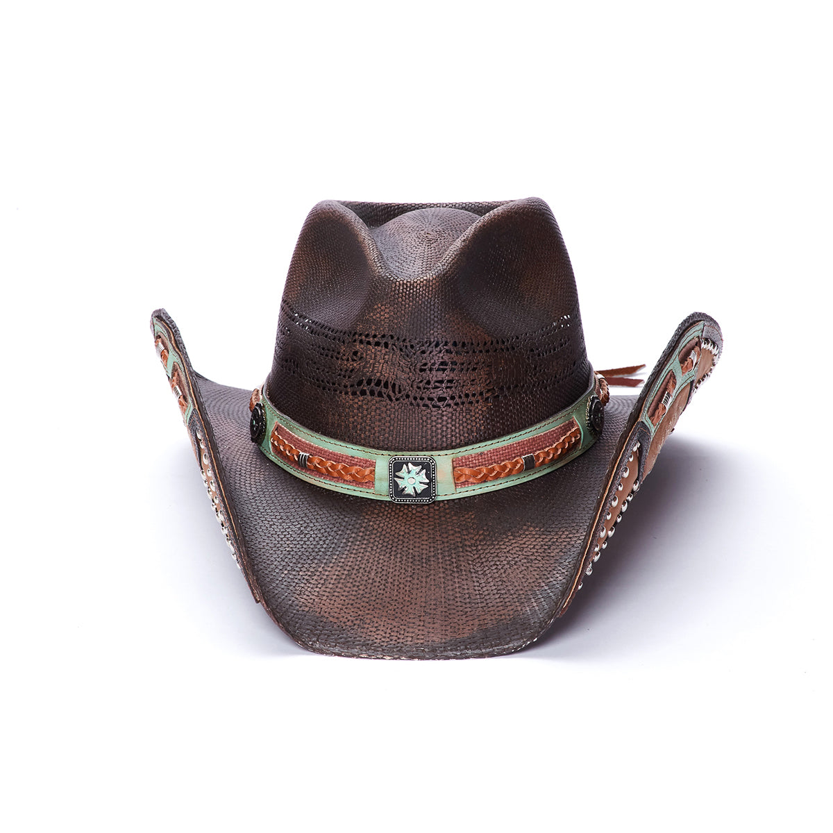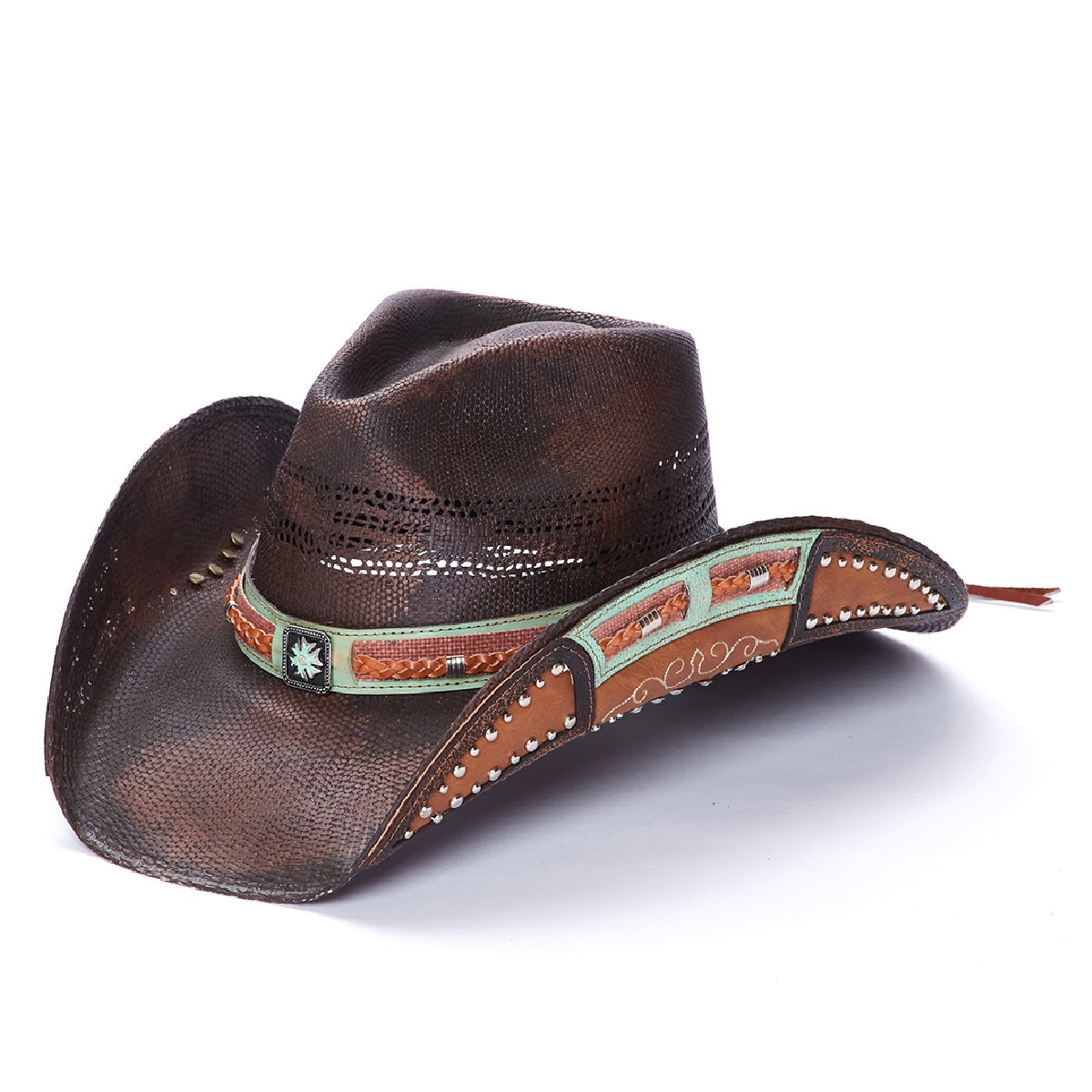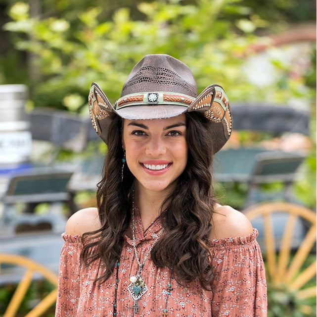 SAVVY from the Stampede Collection is an exquisite hat carefully made of genuine Bangora straw for a sturdy finish. The genuine leather band features a braided design and a small floral buckle. The 3.75 inch brim has a vented crown and design on the rolled brim with mini studs, making this hat a fashionable accessory.